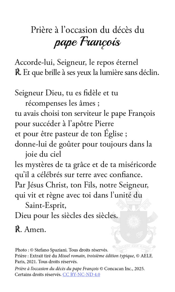 Une carte de prière (PDF) pour le repos de l’âme du pape François, préparée par les Éditions de la CECC (la reproduction ou le partage doivent être effectués à des fins non commerciales.)
