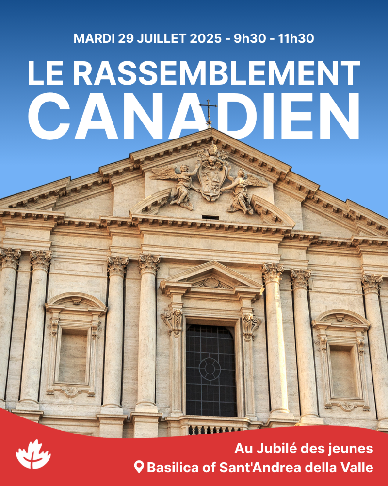 La Conférence des évêques catholiques du Canada a le plaisir d’annoncer qu’un rassemblement spécial de jeunes du Canada aura lieu à Rome le mardi 29 juillet 2025, à l’église Santa Andrea dell Valle (Corso Vittorio Emanuele II 00186 Rome, Italie) pendant le Jubilé des jeunes (du 28 juillet au 3 août 2025), organisé dans le cadre des célébrations de l’Année jubilaire de l’Église catholique.