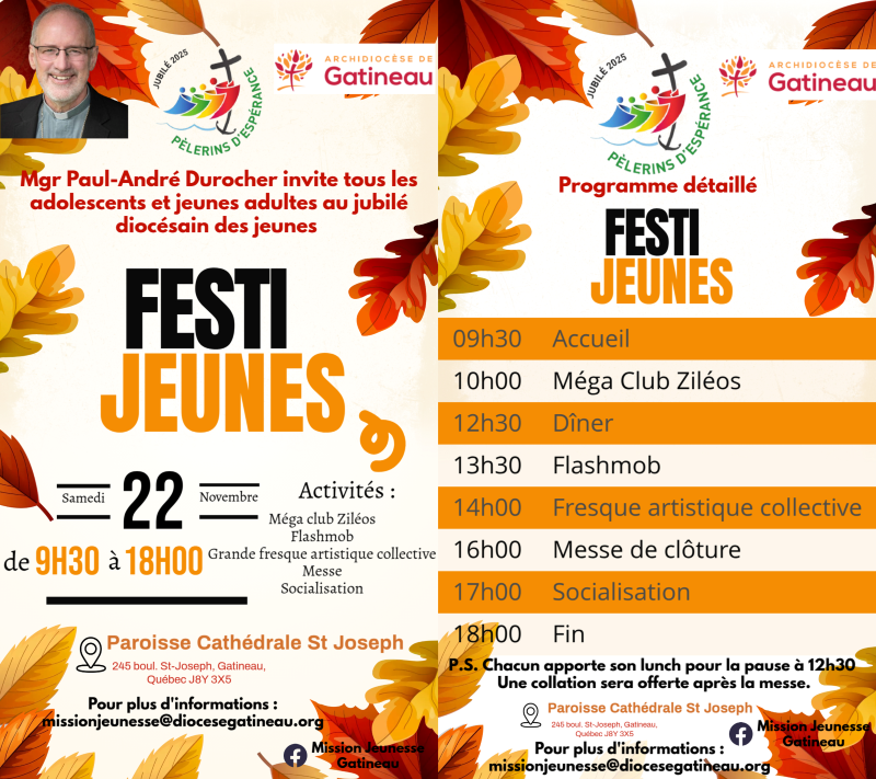 Mgr Paul-André Durocher invite tous les adolescents et jeunes adultes à venir se réjouir au jubilé diocésain des jeunes le samedi 22 novembre de 9h30 a 18h à la paroisse cathédrale Saint-Joseph.